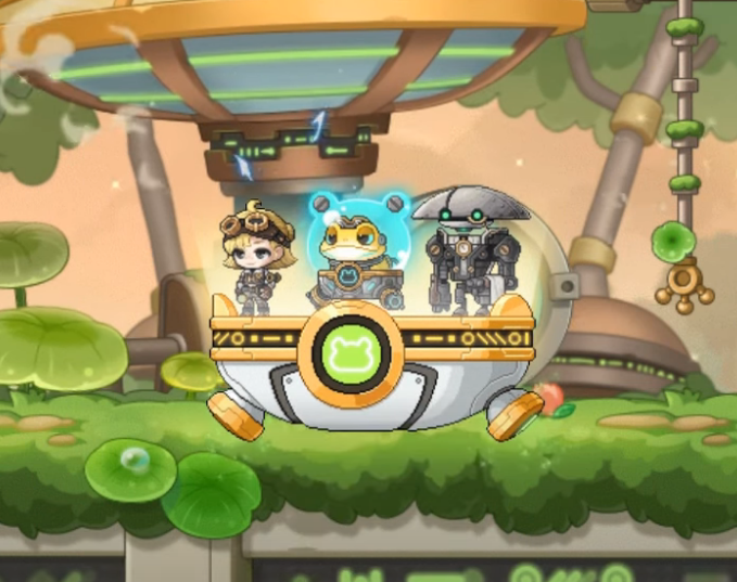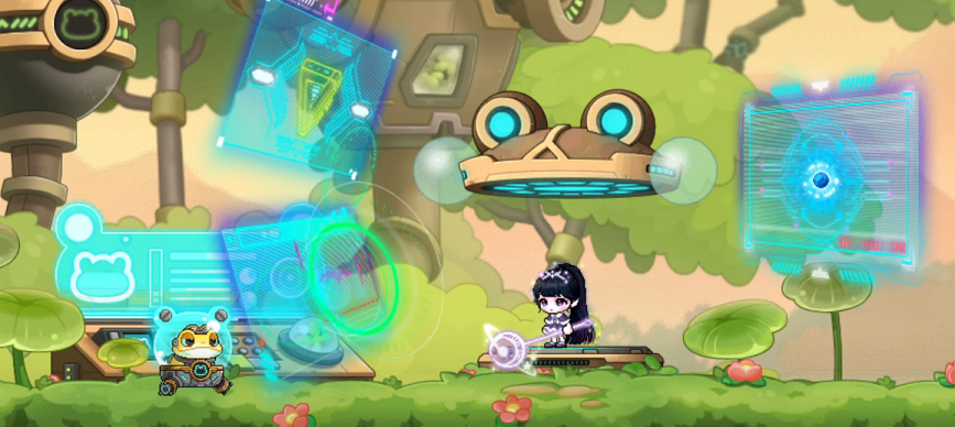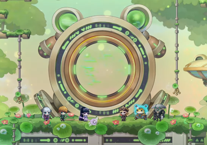 The group then found themselves in a strange, jungle-like dimension filled with lily pad flora and frog-like machinery. They began marveling at how the dimension seemed quite unlike Maple World or Grandis, though the Adversary noted to themselves that it seemed vaguely familiar. As Elwin began talking about the creature which had swallowed them, describing it as a frog, a young woman approached them and laughed that frogs weren’t reptiles, and that even a desert native like herself knew as much. Alongside her, a toad in a hover suit noted that it appeared as though the mages of the present day didn’t seem to study biology much. He added that not just anyone could become a mage back in his day, and that the outside world appeared to have changed quite a bit since then.
