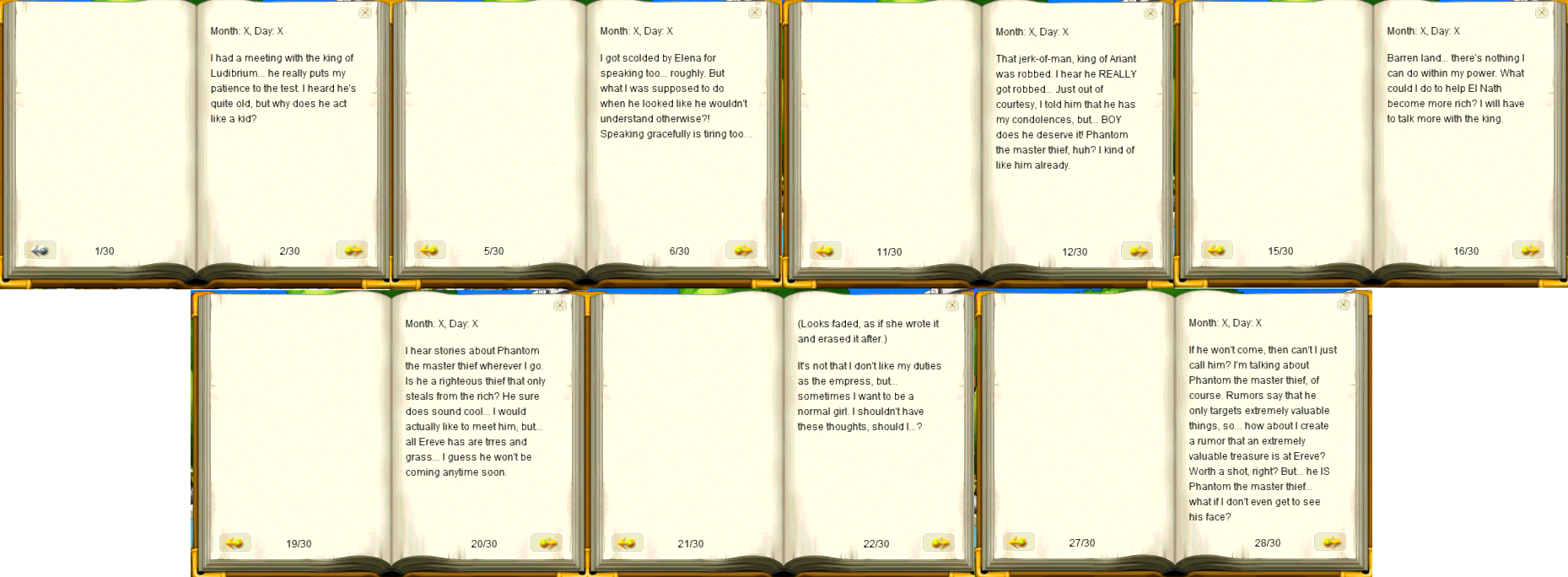 Soon after, Cygnus asked Phantom to visit her in Ereve and told him that while organizing the things left behind by Empress Aria, she had found Aria’s diary, and that she had felt that Phantom ought to have it. Though most of the diary had been damaged, Phantom learned that Aria had also resented the selfish royals of Maple World and had been glad to hear whenever Phantom targeted them. He was surprised to learn that she had wished to meet him, but as Ereve had no real treasures to offer, she had made up the rumor about Skaia in order to draw him out.
